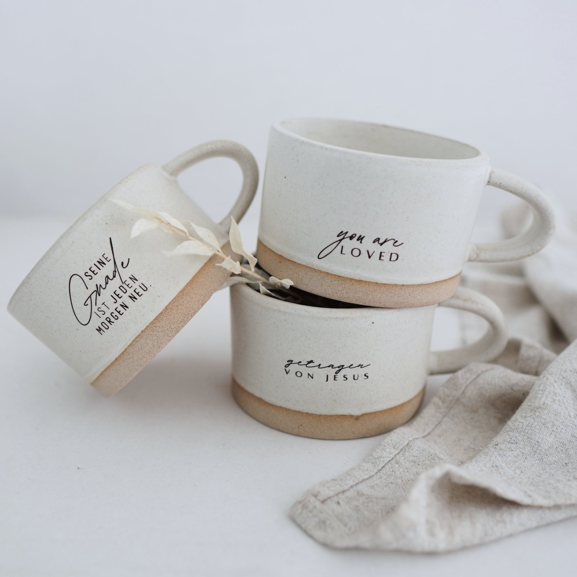 Unsere handgefertigten Tassen und Becher aus hochwertigem Steinzeug verbinden Ästhetik, Qualität und Glauben. Jedes Stück wird mit Präzision gefertigt und trägt eine Botschaft der Hoffnung und Ermutigung.