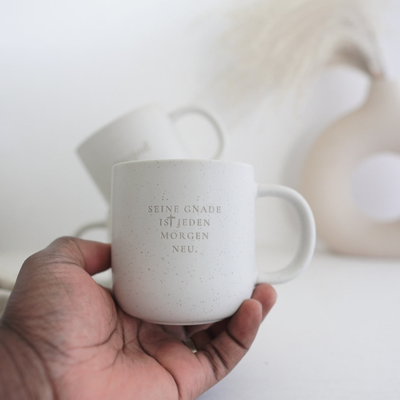 Hochwertige und elegante Steingut-Tasse für gemütliche Kaffee- oder Tee-Momente. Robust, langlebig und stilvoll – perfekt für den täglichen Gebrauch. Die präzise Gravur „Gesegnet – Epheser 1,3“ erinnert dich täglich an Gottes unendliche Gnade und Liebe. Ob zum Start in den Tag oder für eine ruhige Auszeit – diese Tasse schenkt dir Kraft und Inspiration mit jedem Schluck. Ein besonderes Geschenk für dich selbst oder deine Liebsten.
