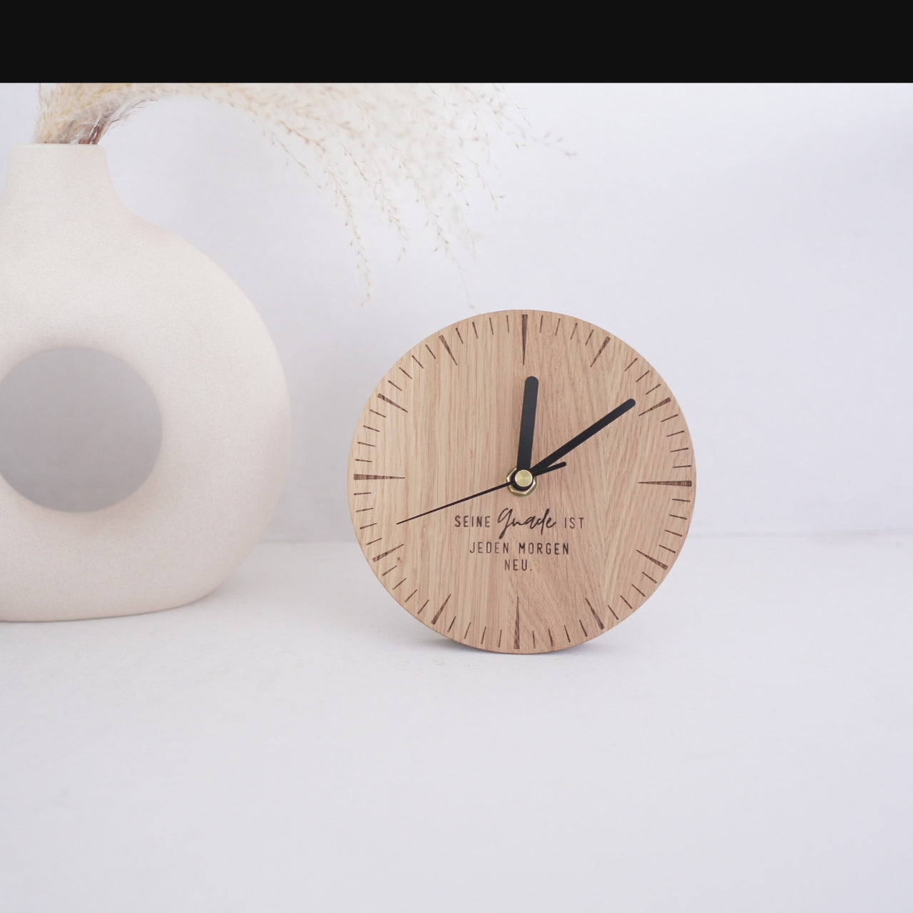 Diese edle Tischuhr aus massivem Eichenholz (gewachst) kombiniert zeitloses Design mit einer inspirierenden Botschaft. Die feine Gravur „Seine Gnade ist jeden Morgen neu“ erinnert täglich an Gottes unerschöpfliche Liebe und Fürsorge (Klagelieder 3,22-23).