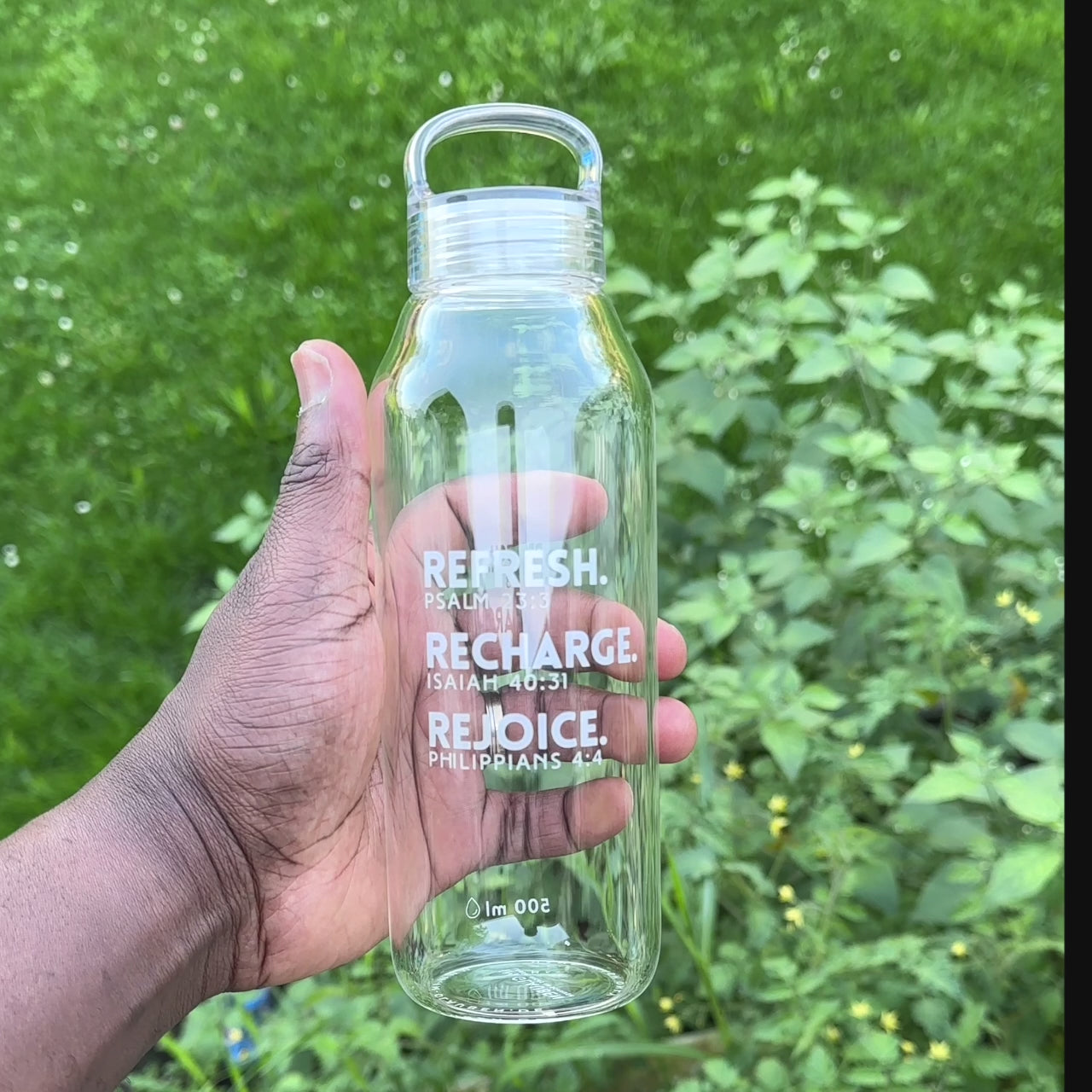 Die Flasche trägt in edler weißer Druckfarbe die inspirierenden Worte (auf Englisch) „Refresh. Recharge. Rejoice.“ – ergänzt durch passende Bibelverse, die diese drei Haltungen mit geistlicher Tiefe erfüllen: